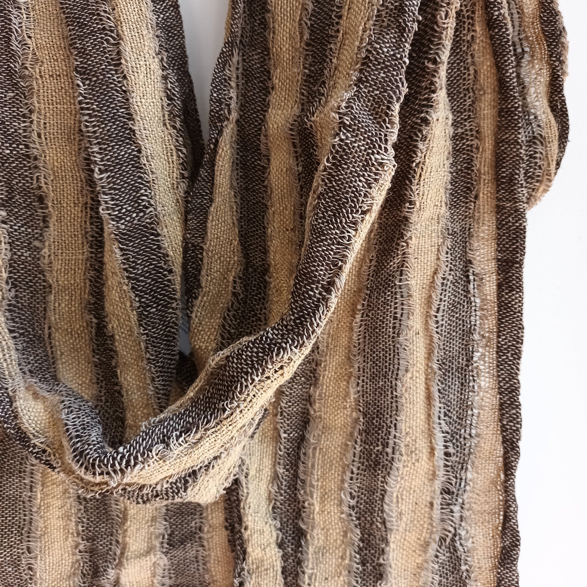 The scarf colours are earthy in appearance resembling the colours of some bees I've seen in my garden. Woven in organic nettle and 16/2 linen.