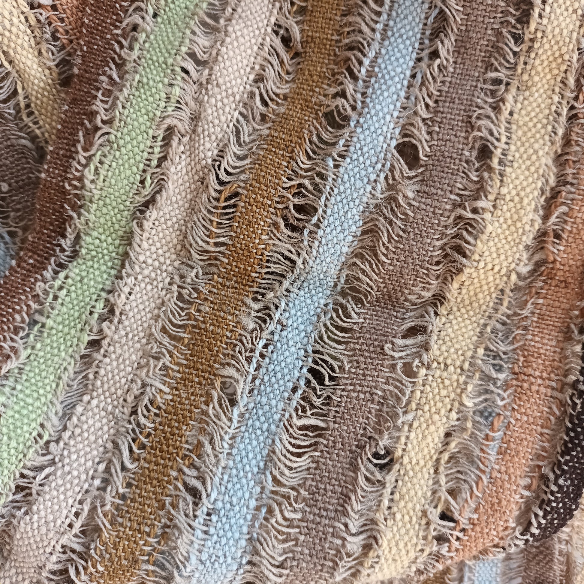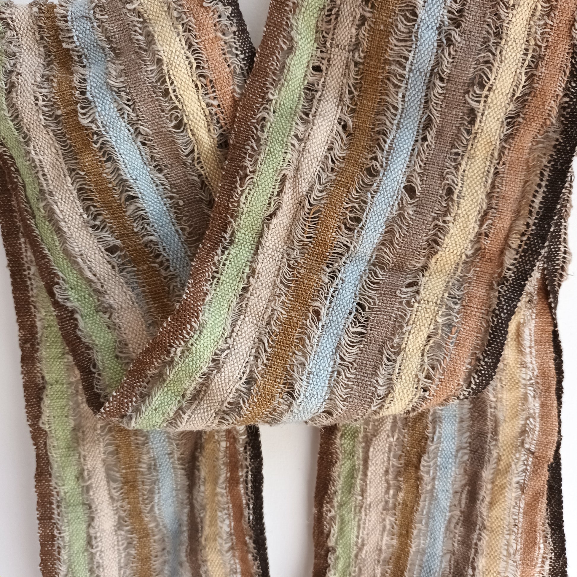 This hand-woven scarf is woven on a floor loom in my studio at Upton Towans where we are cosily tucked into the dunes by the sea. The scarf colours are earthy in appearance resembling the colours of everything Cornwall, especially the elements, sea, sky, and the land that feeds us both literally and visually.